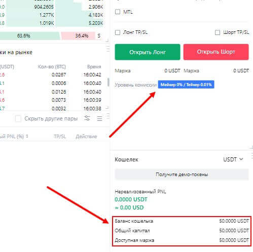 Сумма средств, доступных для торгов можно найти в нижней части страницы. Также там указывается общий капитал и доступная маржа как по шорту (short), так и лонгу (long) позициям. Уровень комиссии по проведению операций изображен под формой оформления заявки на покупку или продажу.