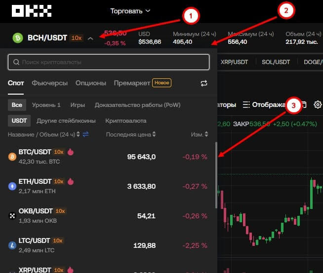 - Выбрать торговую пару. Кликните мышкой на стрелочку, рядом с активом и выберите из списка. Также можно указать в поиске, если точно знаете, какой актив вам необходим.
