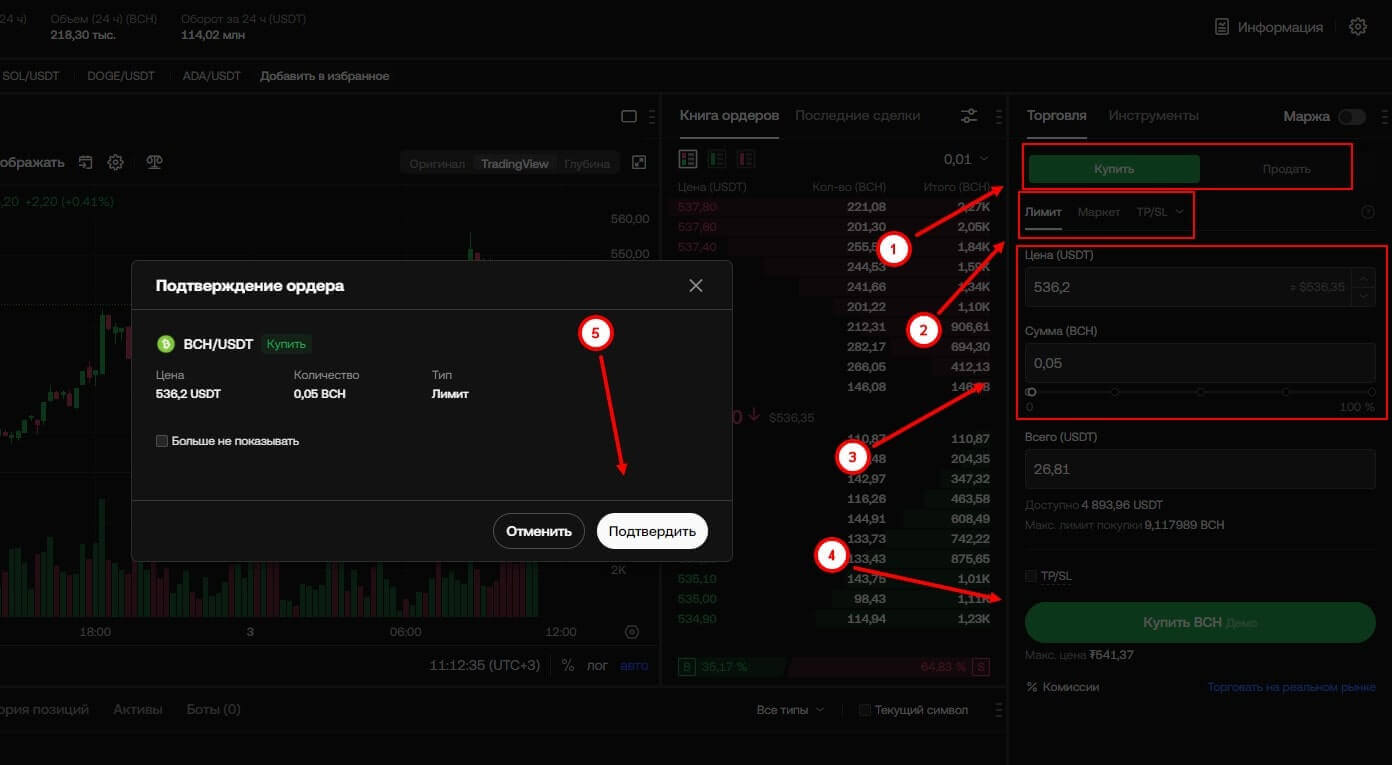 - Заполните информацию. Укажите тип операции (покупка или продажа), тип ордера (лимит, маркет, TWAP-бот), цена (если выставляется лимитный ордер), сумма криптовалют. Затем нажмите на кнопку “купить BCH (или любой другой выбранный тикер)” и подтвердите операцию во всплывающем окне.