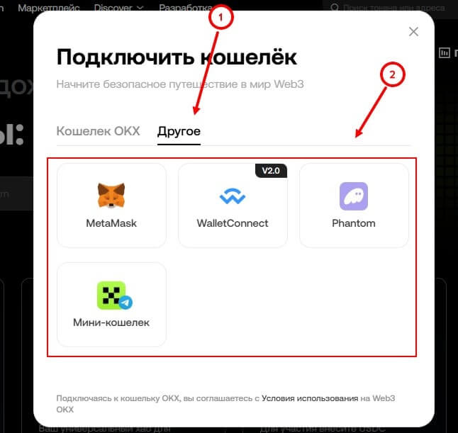 Если же предпочитаете использовать сторонний кошелек, выберите раздел “другие”. Здесь доступны такие варианты как MetaMask, Phantom, мини-кошелек OKX в телеграмме или Wallet Connect. Следуйте инструкциям для завершения подключения.