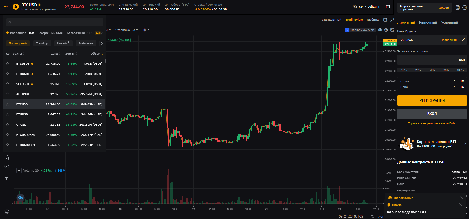 Основной объект, рассматриваемый в работе с фьючерсами Bybit – это цена. Причем для того, чтобы, например, купить 1BTC (курс которого, согласно представленного изображению выше, на дату публикации материала, составлял немногим более 22700$), нет необходимости замораживать полную стоимость монеты. Именно по причине отсутствия подобных финансовых ограничений деривативные секции финансовых рынков пользуются наибольшей популярностью у большинства биржевых игроков – во многих случаях вопросы, как пополнить счет для полноценной работы, отсутствуют.
