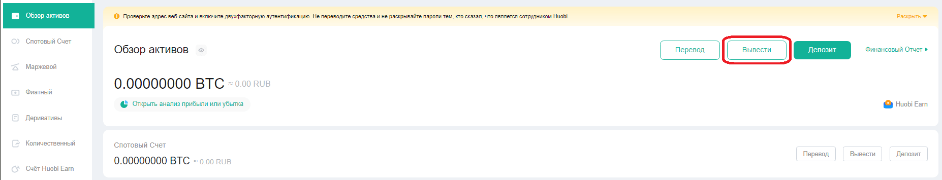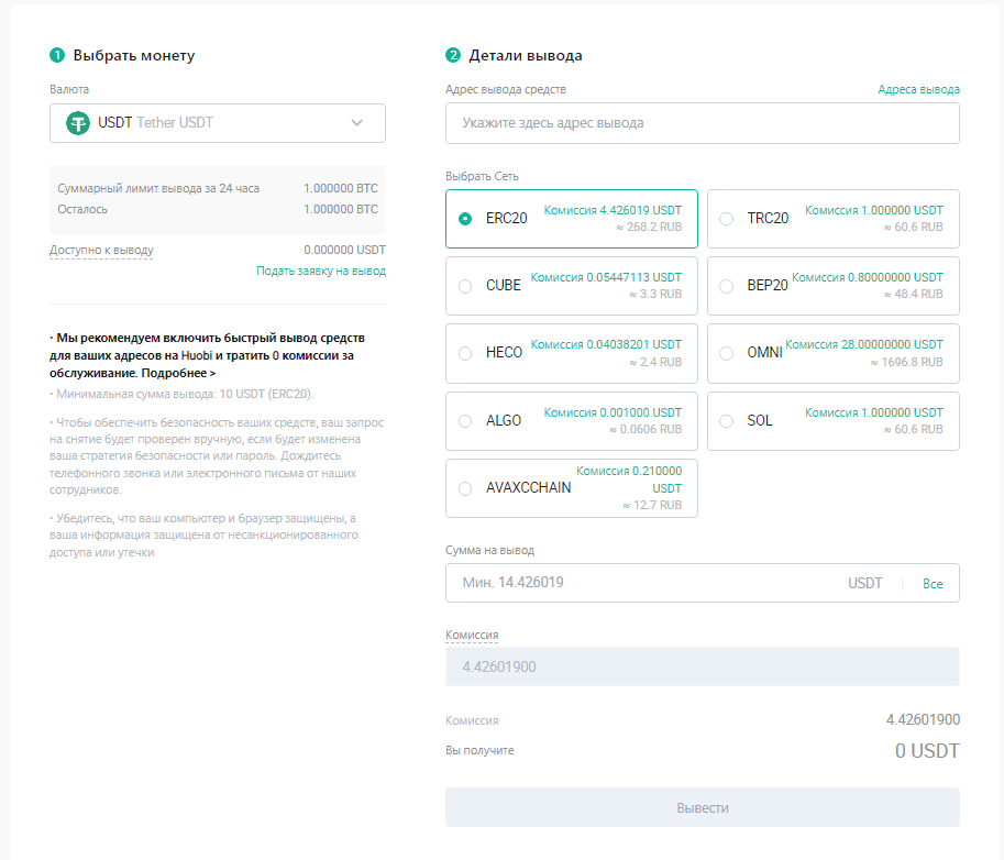 На момент публикации любое списание допускалось только в криптовалютных токенах, никаких других видов денежных средств, фиата или на кошельки электронных платежных систем, не предусматривалось. Потому если необходимо получить с Huobi вывод средств на карту или электронный кошелек, необходимо найти подходящий обменник для проведения такой транзакции и использовать адрес кошелька, на который будет проведена операция, предоставленный выбранной платформой. Особое внимание рекомендуется обращать на поле ввода адреса. При его неправильном указании средства могут быть безвозвратно потеряны.