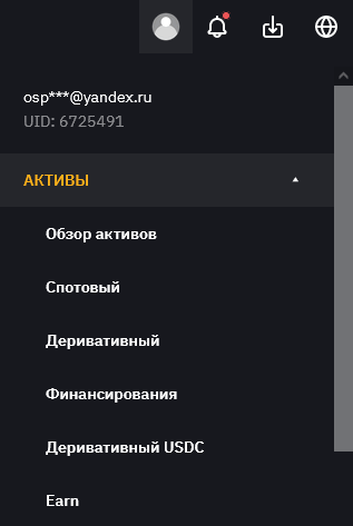 Открываем меню активов и выбираем определенный тип счета. Биржа предоставляет возможность работать со следующими обособленными видами аккаунтов: