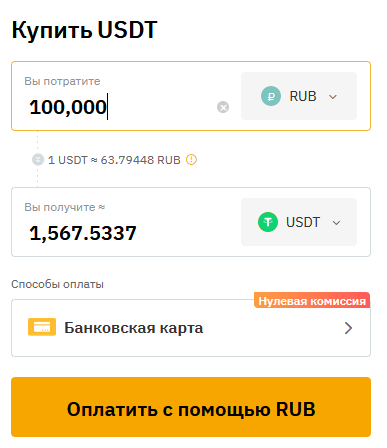 Интерфейс страницы для покупки криптовалюты автоматически изменяет количество доступных к приобретению монет, в зависимости от веденной суммы в рублях. Есть ограничение на минимальную сумму одной транзакции – допускается вносить от 3000 рублей. Максимальный порог установлен на уровне в 100 000 рублей. На момент написания материала покупка токенов с максимальным ограничением позволяла получить 1567 USDT.