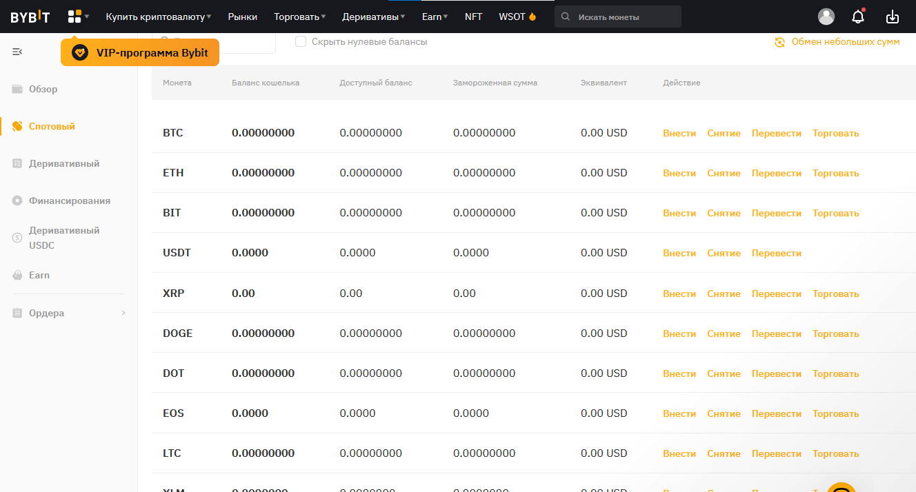 Еще один способ – через спотовый аккаунт. В данном случае откроется другое окно, в котором представлены все открытые токены. Для предлагаемого способа становится возможным не только пополнение, но и снятие, передача или торговля выбранными криптотокенами.