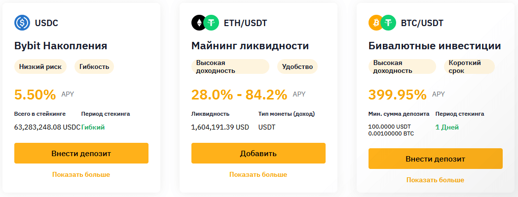 - Earn – для пассивного заработка на стейкинге, майнинге ликвидности или инвестициях в бивалютную корзину имеющихся монет