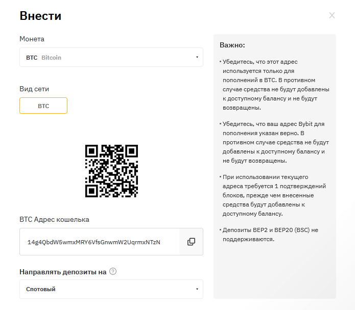 В зависимости от выбранной монеты, происходит перенаправление на соответствующую страницу, где необходимо скопировать предлагаемый биржей адрес для поступления транзакции и определиться с типом аккаунта, на который будет произведено зачисление (изображении ниже показано на примере BTC, для других криптовалют интерфейс идентичен).