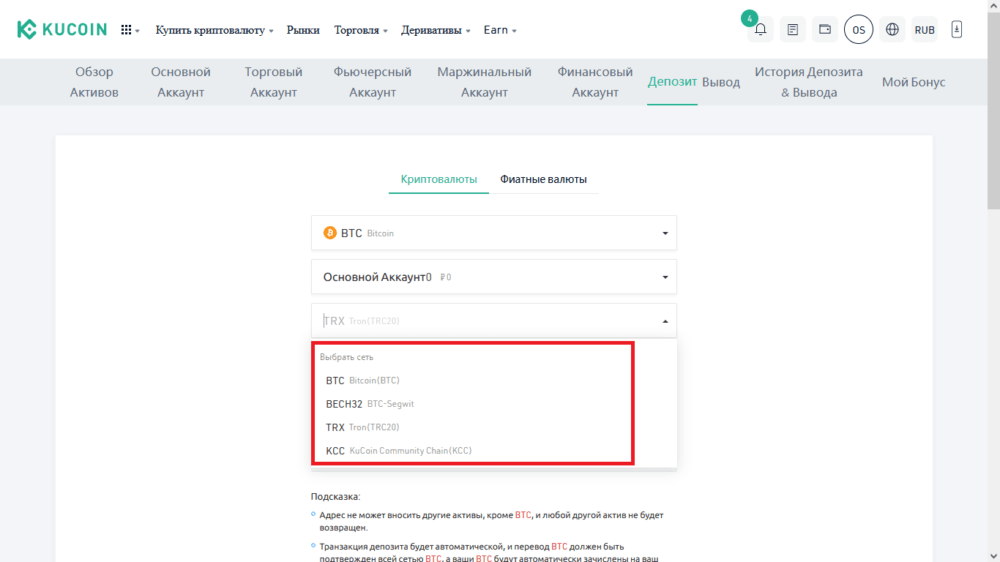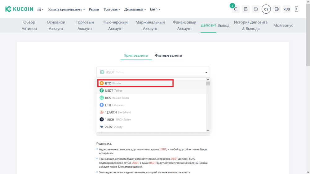 Первый раздел «Криптовалюты», открываемый по умолчанию, предполагает зачисление на свой депозит уже имеющихся токенов с кошельков любых сторонних платформ. Например, при необходимости зачислить биткоины пользователь должен выбрать эти монеты в выпадающем списке.