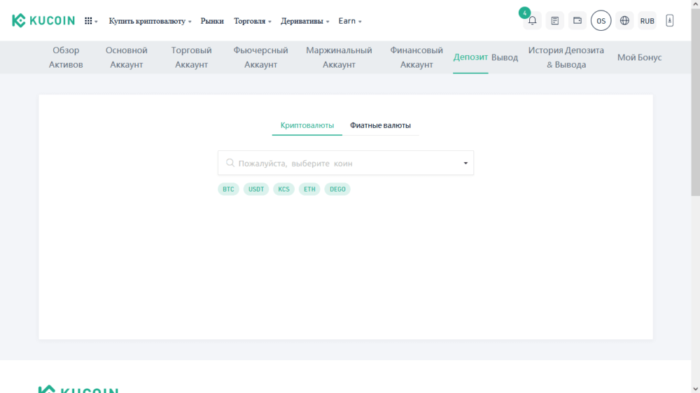 Произведя вход в личный кабинет на официальном сайте Kucoin, пользователь попадает в меню личного кабинета, где производятся все финансовые манипуляции – вывод и увеличение баланса. Для запуска процедуры внесения денег открываем соответствующий раздел в меню управления.