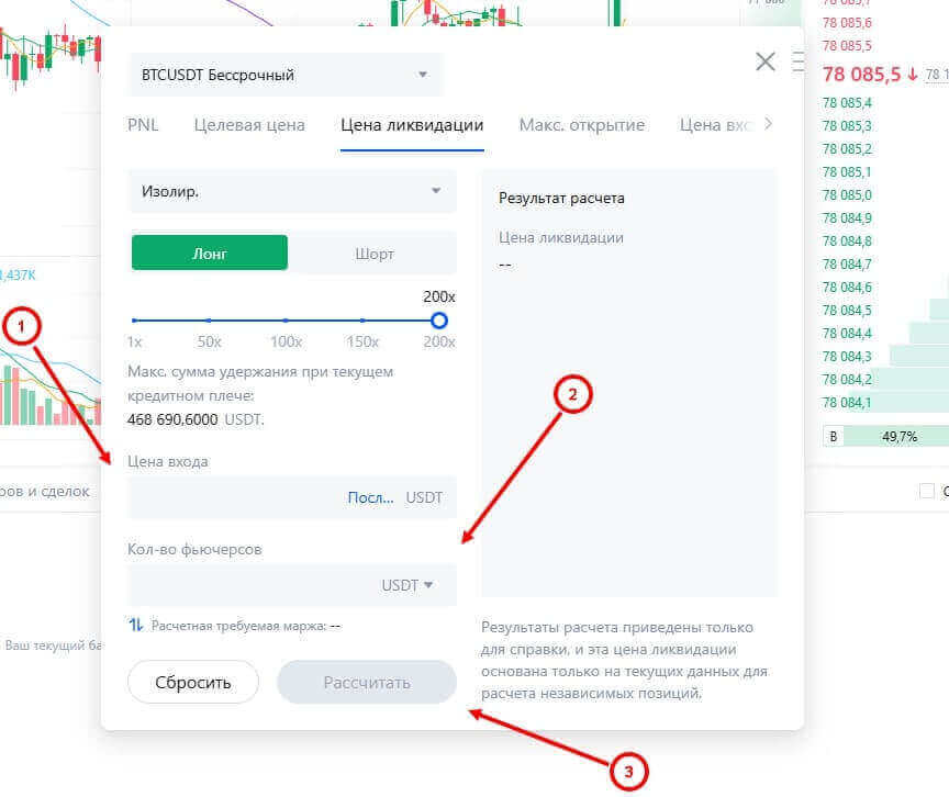 - Цена ликвидации – предоставляет информацию о том, по какой цене фьючерсный контракт будет ликвидирован. Для использования выберите раздел, укажите цену входа, количество фьючерсов и доступная маржа (если выбран тип кросс-маржи). Система рассчитает сумму ликвидации вашего контракта.
