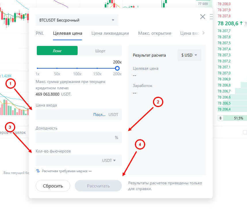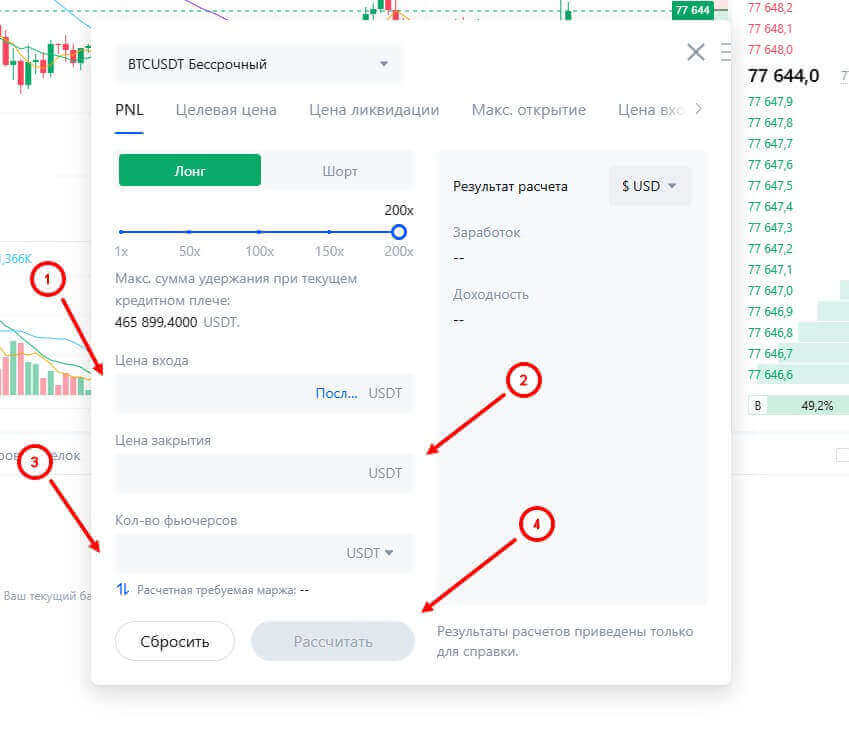Пользователи могут рассчитать PNL или риски с помощью калькуляторов, которые доступны на странице с фьючерсной торговлей. Для использования перейдите в раздел “фьючерсы” – “USDT-M” и в правой части нужно нажать на иконку “калькулятор фьючерсов”. Основные категории для расчета:
