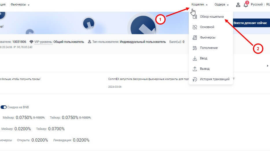 - Войдите в свой аккаунт на Коммекс и перейдите в раздел “Кошелёк” – “Обзор кошелька”.