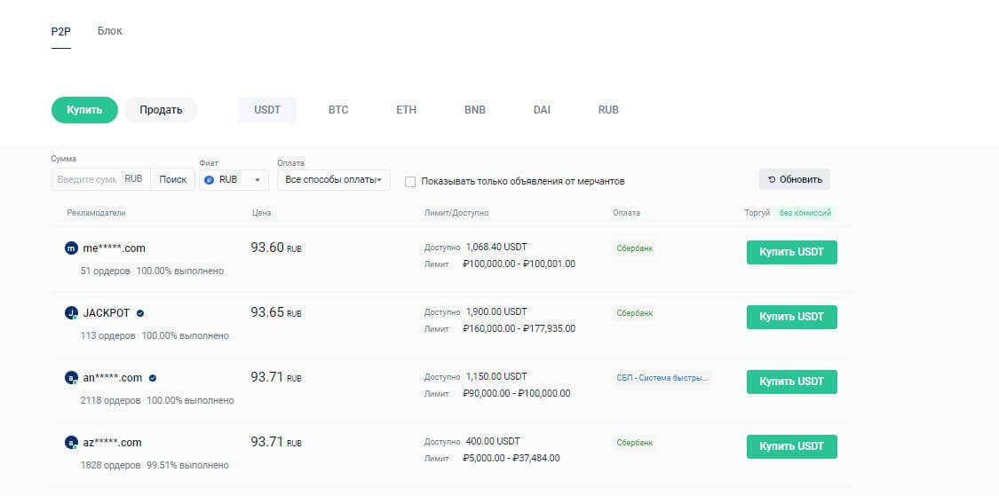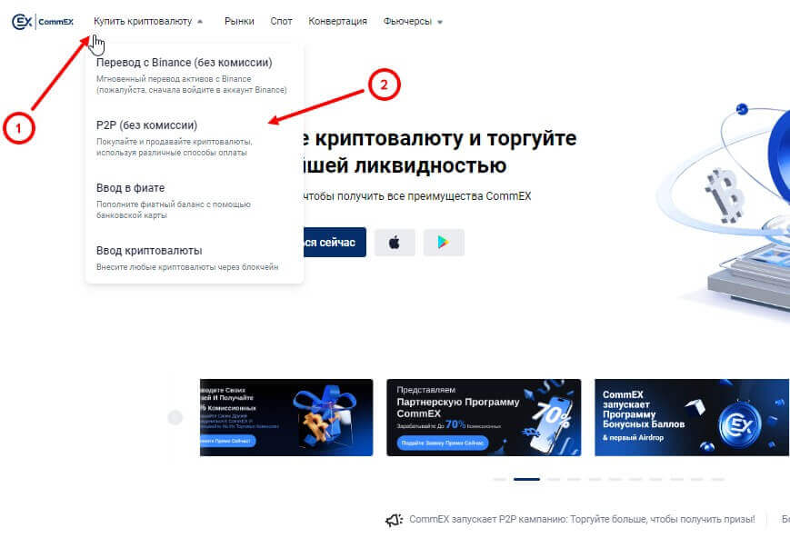 - Перейдите “купить криптовалюту” – “P2P (без комиссии)”.