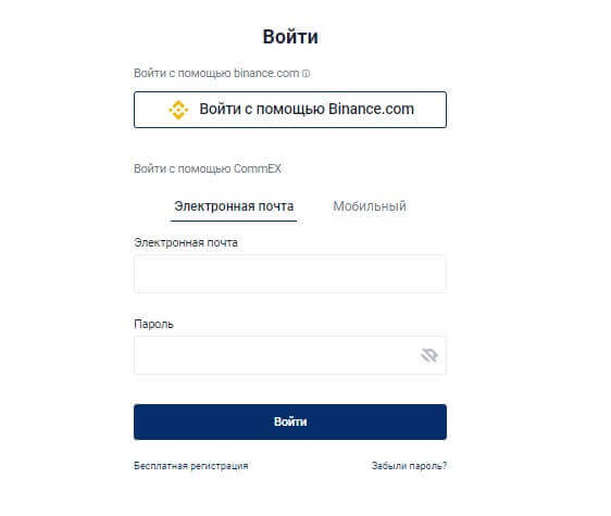 - Сначала войдите в свой аккаунт, используя регистрационные данные или аккаунт Binance на CommEx.