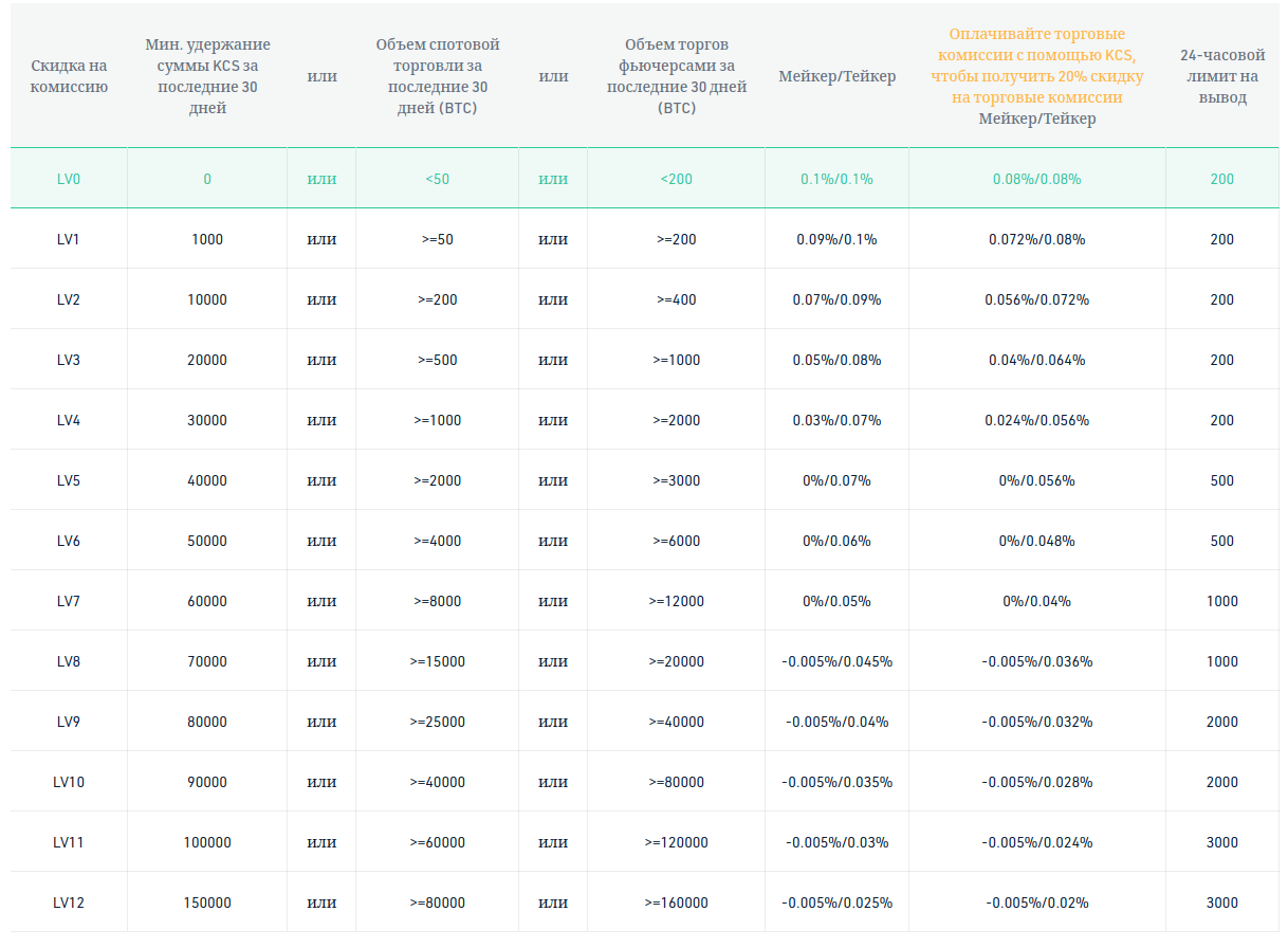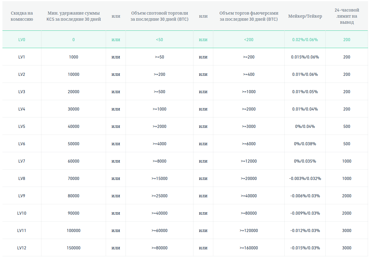 Обращаем внимание, что на уровне 8 и выше трейдеры не только не уплачивают никаких средств за торговлю, но и получают от биржи вознаграждение за проявляемую торговую активность. Отдельно предоставляется скидка за использование при расчетах токена KCS.