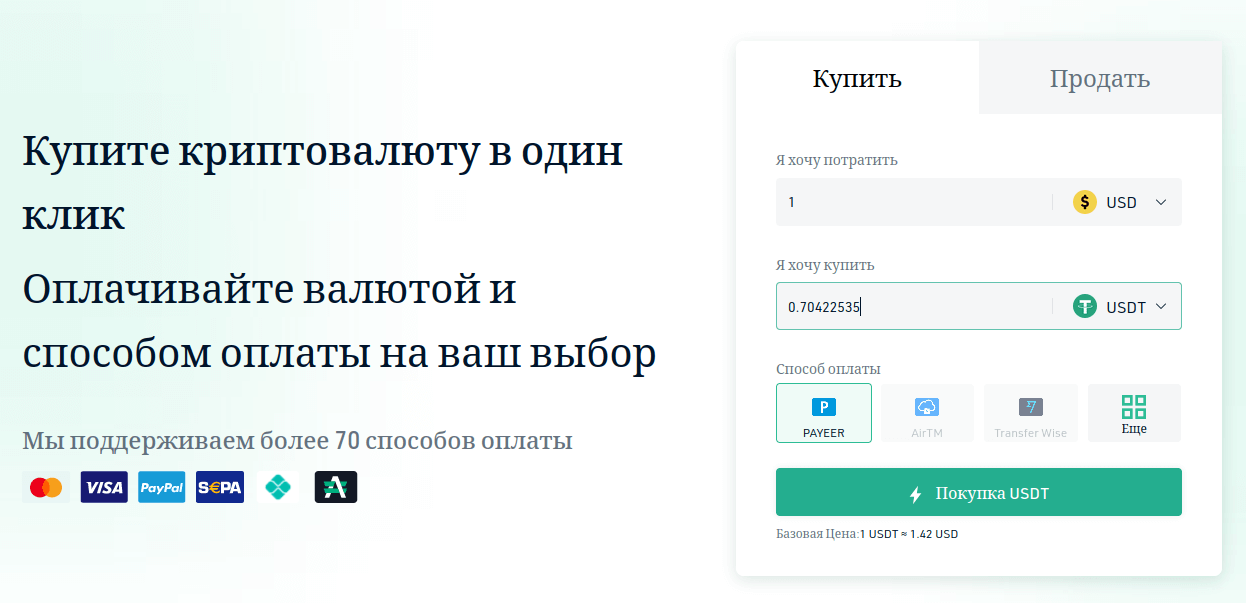 Через данный сервис купить любой интересующий токен клиент биржи можно всего в несколько кликов. Необходимо выбрать фиатную валюту, в которой будут произведены расчеты и токен для покупки. Для примера ниже приведена операция приобретения монет USDT за американские доллары по курсу 1.42$ за каждый USDT. В качестве способа оплаты предлагались электронная платежная система PerfectMoney, Payeer или Webmoney. Для каждой платформы предусмотрен свой уровень дополнительных плат за проведение операции, который формируется при подтверждении на финальном этапе.