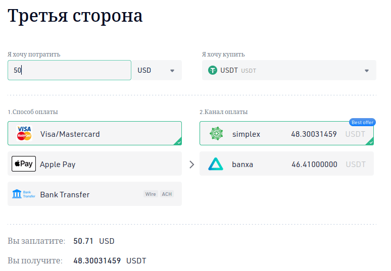 Во многих случаях подобные транзакции имеют более существенные ограничения как по минимальной сумме (например, для перевода долларов в USDT требуется задействовать не менее 50$), так и по доступным токенам. Заплатив 50,71$, инициатор платежа получит на баланс 48,3USDT. Объем конкретных пошлин зависит от используемой фиатной валюты и планируемой к получению криптомонеты. С помощью данного сервиса можно получить возможность пополнения аккаунта с банковских карт или Apple Pay, что для других методов недоступно, но и способов как снизить накладные расходы в данном случае нет.