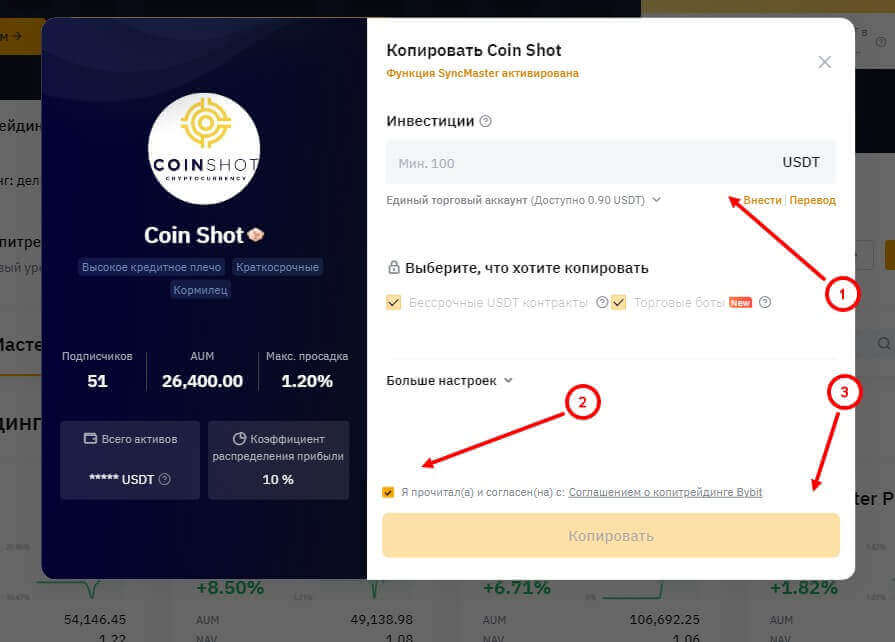 - Укажите сумму инвестиций (минимум от 100 долларов) и выберите что планируете копировать, согласитесь с правилами и соглашением о копитрейдинге ByBit, после чего нажмите на кнопку “Копировать”.
