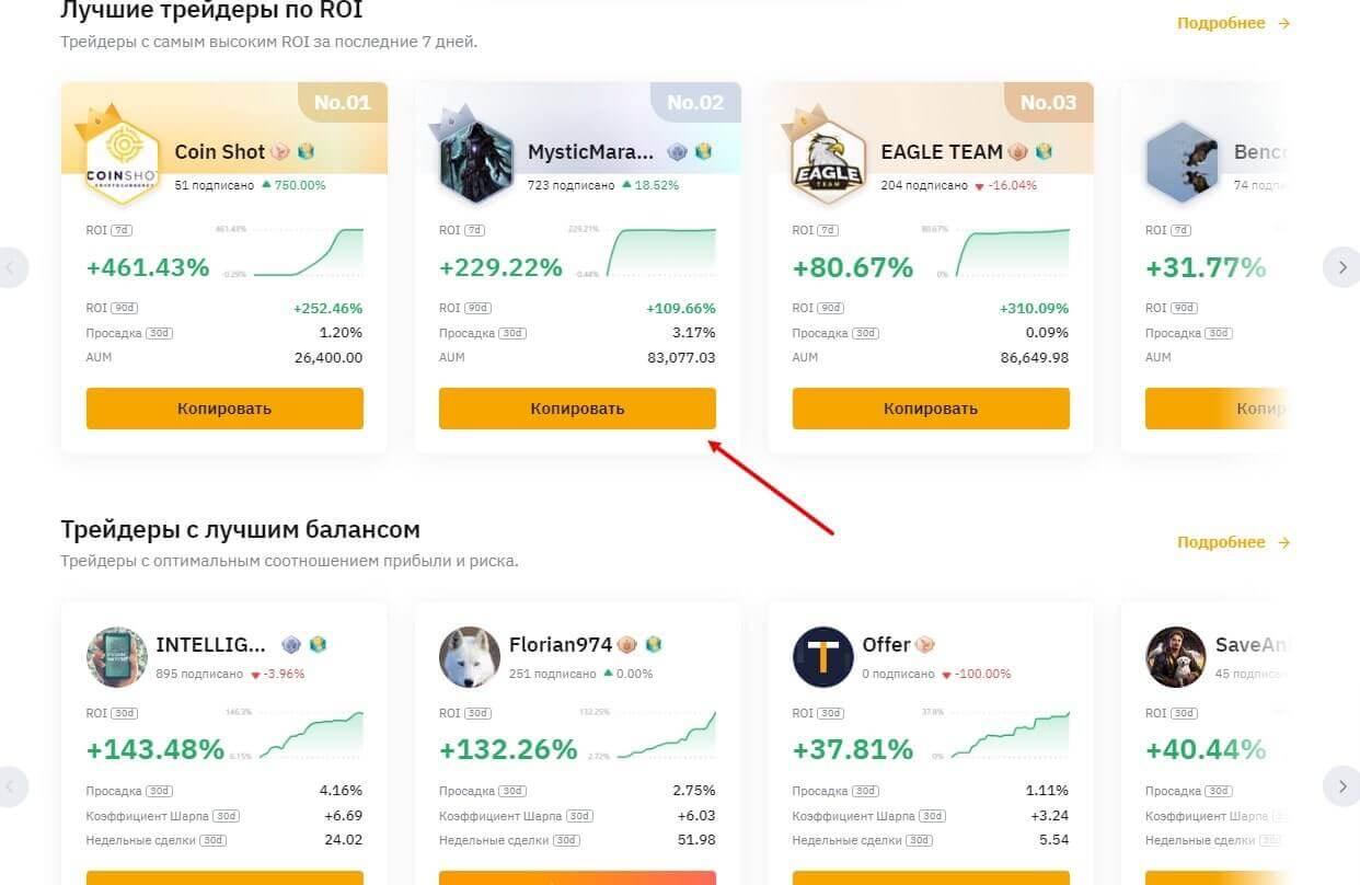 - Здесь вы найдете список трейдеров, доступных для копирования. Ищите трейдера на основе его истории фьючерсной торговли, статистики, рейтинга и общей стратегии. Учитывайте риски и не вкладывайтесь в трейдеров с чрезмерно агрессивными или непонятными стратегиями. Нажмите на “Копировать” после выбора.