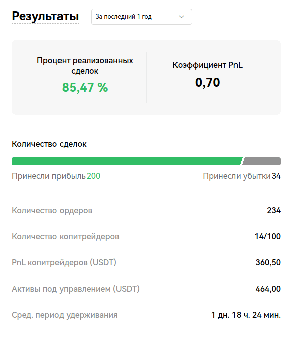 Показатель прибыли и убытков — один из наиболее критичных. Следует учитывать не только сам уровень роста (если речь идет о падении, такому биржевику просто не стоит доверять управление своими средствами), но и его поступательный характер, без резких рывков и изменений в любом из направлений — прибыли или убытков. Указанный лид имеет показатели 140% годовых и 13,97% за последний анализируемый месяц. На графике PnL отсутствуют значительные провалы доходности, а процент реализованных сделок составляет 85,47% с коэффициентом прибыли в 0,7, что является отличным индивидуальным результатом.