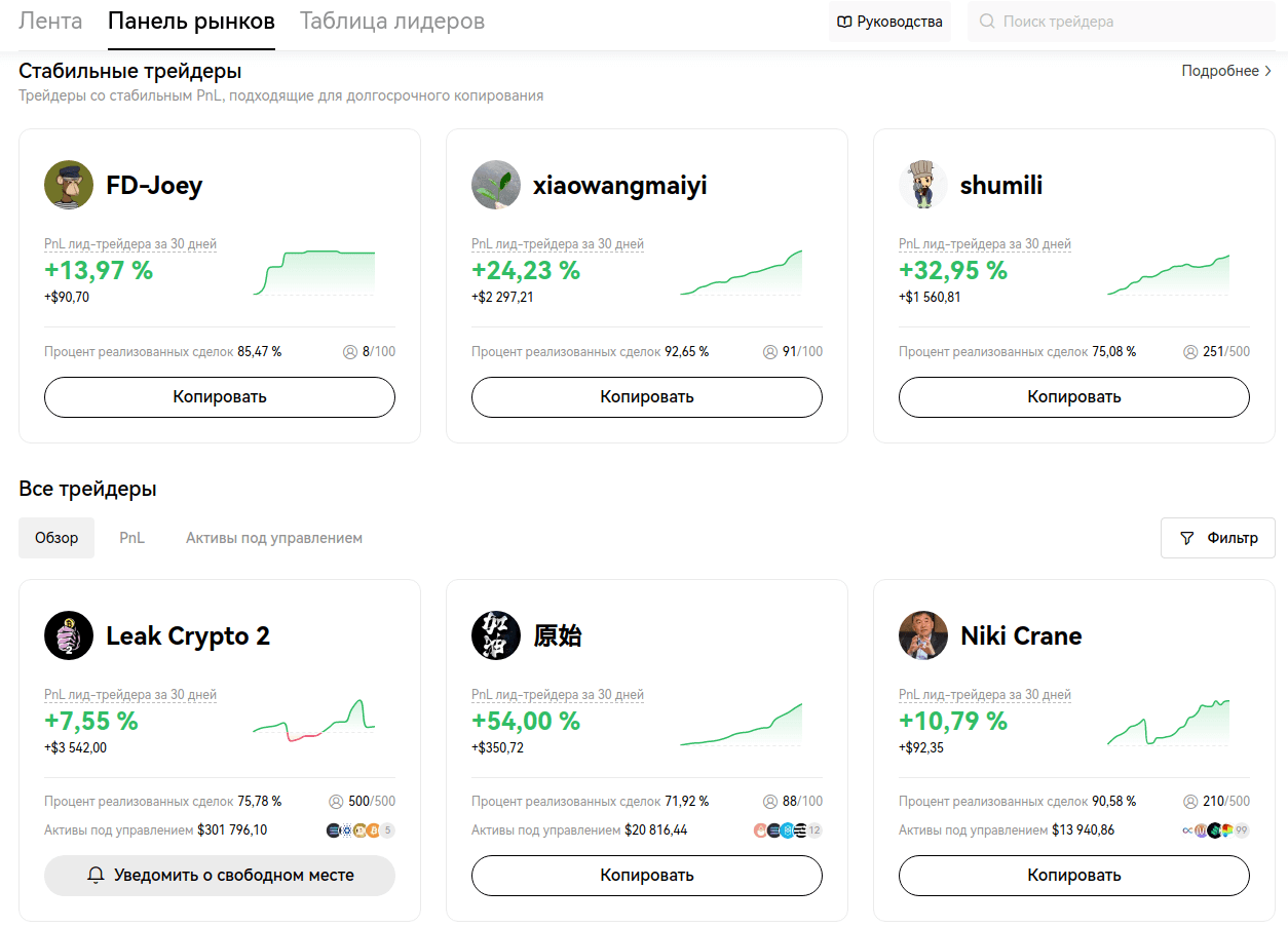 Выбрав подходящего лид-трейдера из таблицы лидеров, рекомендуется внимательно изучить подробную информацию по демонстрируемым им результатам деятельности. Сделать это можно перейдя по ссылке «Копировать». На открывшейся вновь странице представлена вся необходимая информация о конкретном участнике системы копитрейдинга на OKX.