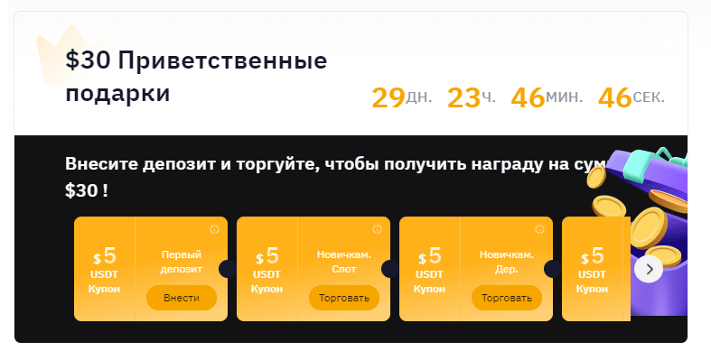 - Приветственные подарки. Общее количество денежных средств, которые можно получить – 30$. Они поделены 6 видов бонусов по 5$ каждый: верификацию аккаунта, активный трейдер в течение 3 дней, новичкам за торговлю деривативами на 1 и 1000$, за первое пополнение счета на 10$, а также спотовая торговля минимум на 1$.