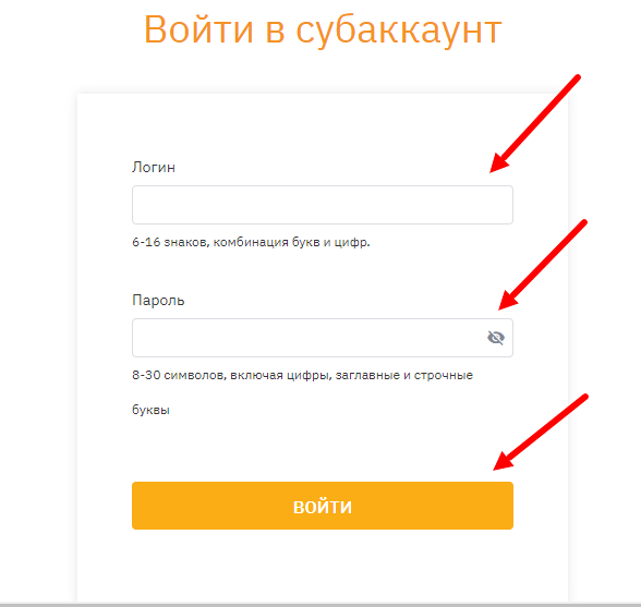 - После этого откроется форма для входа в субаккаунт, где нужно будет ввести логин и пароль, а затем “Войти”.