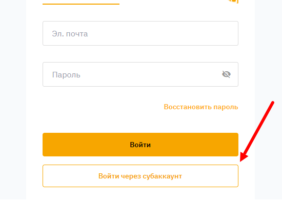 - Нажмите на кнопку “Войти через субаккаунт”, который находится ниже кнопки “Войти”;