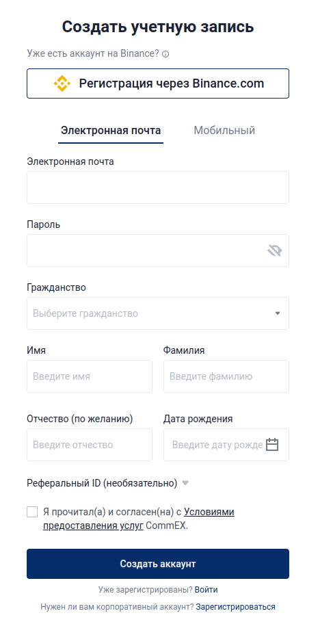 Переход к созданию нового аккаунта в Коммекс осуществляется через соответствующую ссылку в верхнем правом углу сайта. Далее будем рассматривать работу через веб-интерфейс на русском языке. Недавно рядовым трейдерам стал доступен функционал через мобильную версию для Android и iOS, бесплатно скачать которую можно по предложенным на сайте ссылкам. Логика открытия аккаунта во всех случаях идентична, незначительно отличается лишь расположение рабочих элементов.