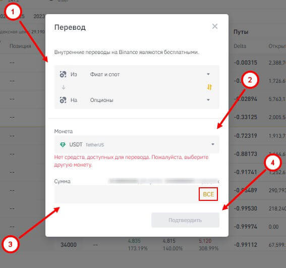 Откроется окно, где нужно выбрать из какого счета вы будете переводить на опционы, монету и сумму. Если планируете перевести все монеты определенного криптоактива, то нажмите на кнопку все или же введите количество монет во вкладке «сумма». Затем нажмите на кнопку «Подтвердить» и через несколько секунд средства окажутся на счету.
