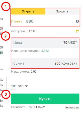 После выбора опциона, откроется панель в правой части, где нужно выбрать открытие или закрытие опциона, выбор типа цены актива: лимитный или BBO, указать цену опциона и сумма покупки. Нажмите на зеленую кнопку «Купить» или красную «Продажа».