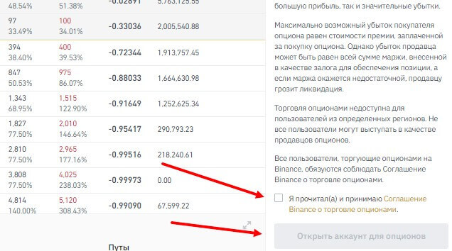 Затем на новой странице в правой нижней части нужно поставить галочку на пункте «Я прочитал(а) и принимаю Соглашение Binance о торговле опционами.» и нажать на кнопку «Открыть аккаунт для опционов». Затем ваш личный счет на Бинансе по торговле опционами будет успешно открыт.
