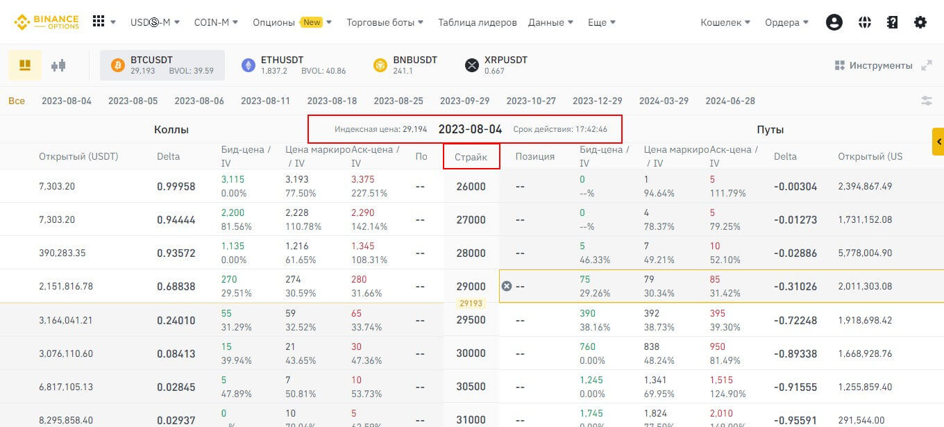 На экране можно заметить опционы Call и Put. Как было обозначено выше, с помощью первого человек может получить право на покупку базового актива, однако не обладая при этом обязанностью исполнять. А второй же на продажу актива с теми же полномочиями. Сверху можно увидеть расчетную дату и на какой валюте будет основываться производный контакт. «Страйк», расположенный посередине – цена исполнения, по которому опцион будет закрываться на дату экспирации.