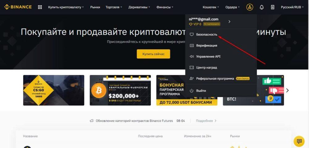 Чтобы не потерять средства, разработанные в процессе совершения операций на бирже, можно повысить безопасность аккаунта. Для этого нужно зайти в одноимённый раздел, наведя курсор мыши на значок профиля и кликнув на пункт во всплывающем меню.