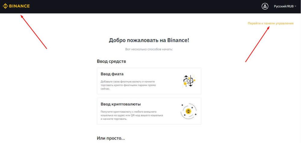 Поздравляем, первичная регистрация Binance завершена. Если все сделано правильно, новому пользователю предложат пополнить счёт с помощью одного из доступных способов. Вносить деньги сразу необязательно. Можно продолжить знакомство с платформой, кликнув на пункт «перейти к панели управления» или нажав на логотип Binance.