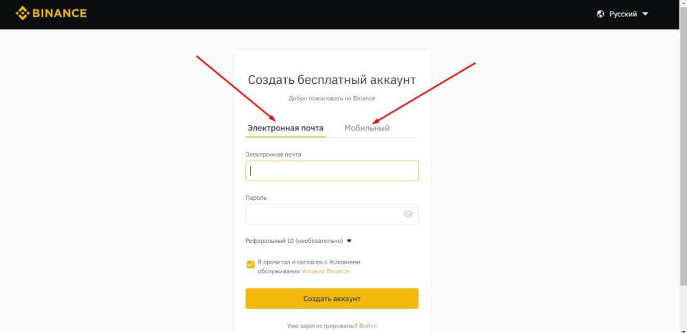 Изначально нужно перейти на официальный сайт Бинанс и кликнуть на кнопку «регистрация». Она расположена в левом верхнем углу. Кнопка доступна с любой страницы сайта.