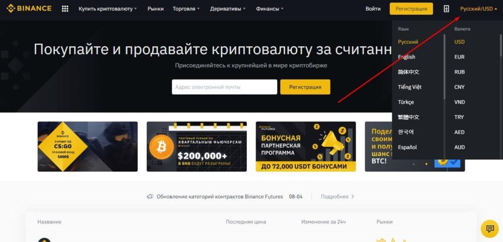 Если страница отображается на английском, можно поменять язык на русский. Для этого нужно навести курсор на всплывающие раздел рядом с кнопкой «регистрация» и выбрать подходящий. Система поддерживает 14 языков.