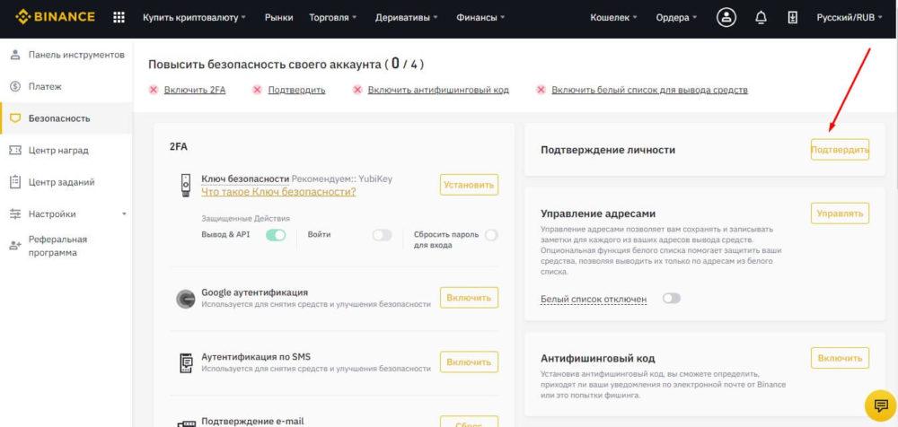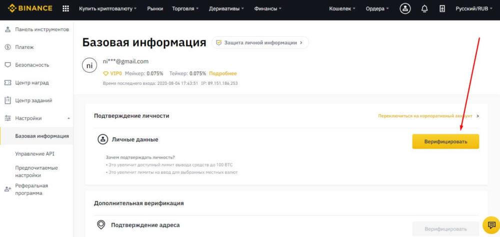 Проходить верификацию аккаунта на бирже криптовалют Binance необязательно. Все возможности торговли доступны без подтверждения личности. Однако площадка устанавливает ограничения на вывод. Если идентификация не пройдена, в сутки нельзя вывести сумму, превышающую 2 BTC или эквивалент в иной валюте. Подтверждение данных повысит ежедневный лимит до 100 BTC. Чтобы пройти первый этап верификации, необходимо: