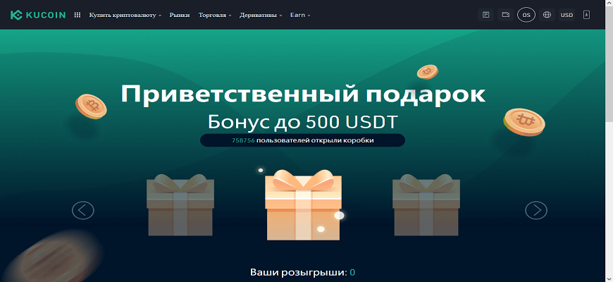 - Бонус всем новым участникам за первое приобретение криптовалюты на свой депозит. Каждому новоиспеченному члену платформы за первую покупку токенов на счет предлагается участие в розыгрыше с призовым фондом до 500USDT. Размер вознаграждения можно узнать, открыв выбранную подарочную коробку.