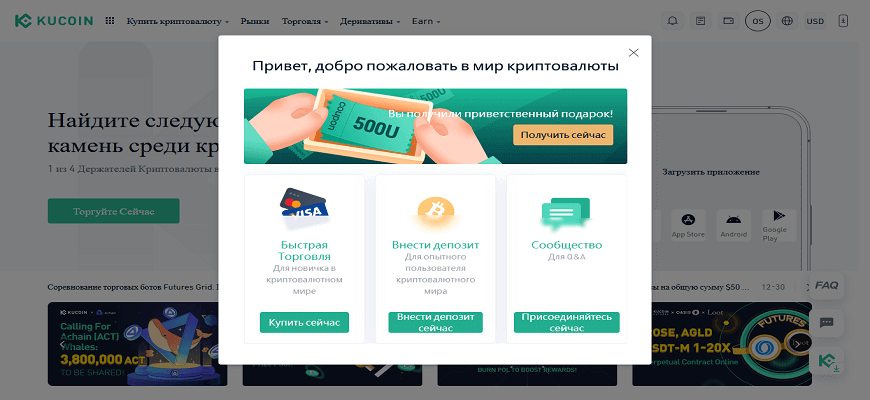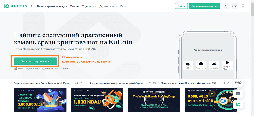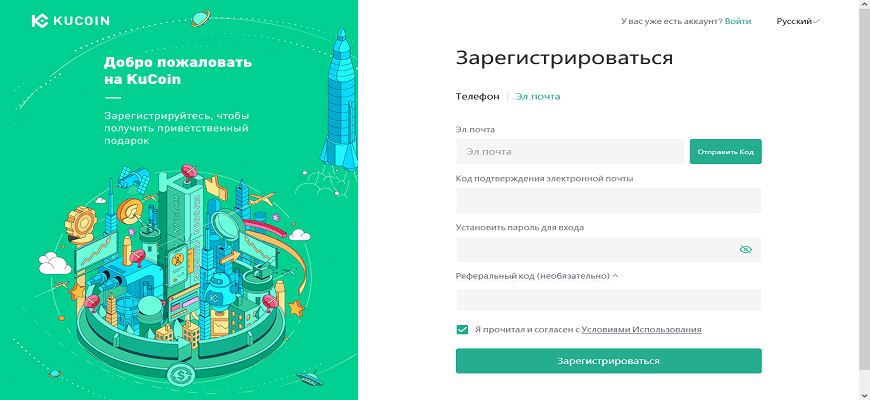 Все операции производятся с главной страницы официального сайта https://www.kucoin.com/ru/. Для инициализации процесса получения личного аккаунта, нажимаем на соответствующую кнопку.