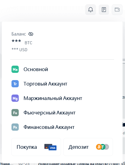 Далее располагается раздел баланса депозита, здесь представлена информация о текущем балансе по каждой из биржевых секций – спотовой, маржинальной или фьючерсной. Можно провести пополнение счета, либо внести токены на депозит.