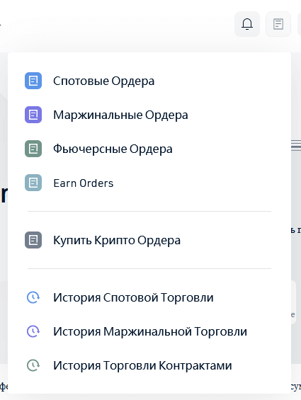 В торговом блоке представлена вся информация по имеющимся позициям во всех существующих разделах биржи – спотовых, маржинальных и фьючерсных ордерах, а также вся история по проведенным сделкам.