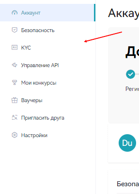 После этого в левом меню следует нажать на “ KYC”. Там происходит процедура по верификации личного аккаунта.