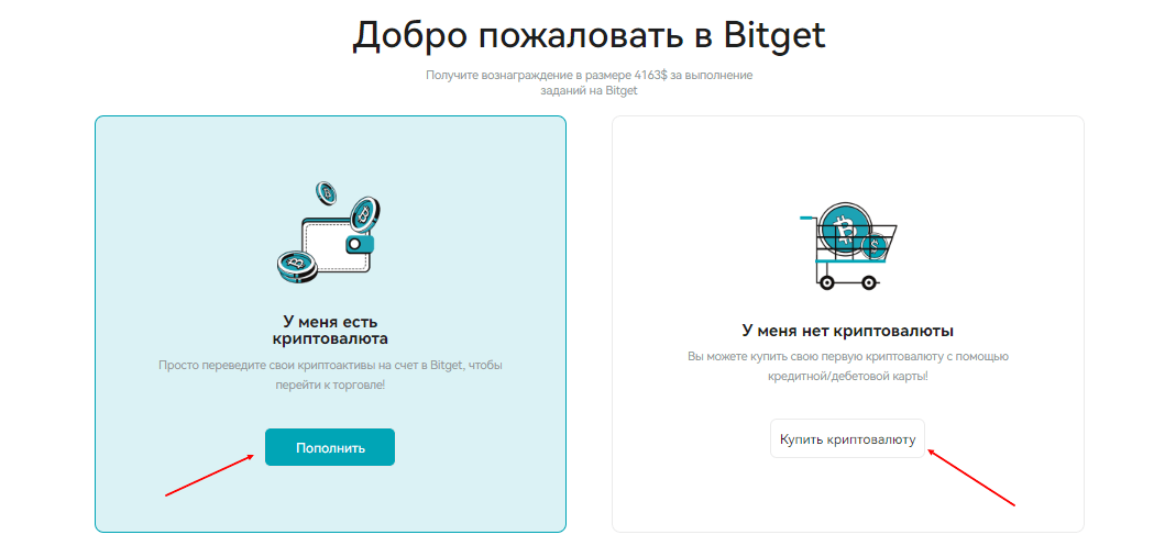 После этого процедура регистрации будет завершена и вас встретит приветственное окно с предложением пополнить свой счет с помощью перевода денежных средств со своего криптовалютного бумажника или фиата, если отсутствует криптовалюта в личном кошельке.