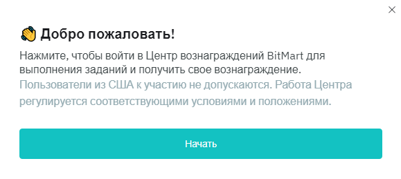 После входа в личный кабинет на официальном сайте появляется приветственное сообщение и предупреждение о том, что резиденты США не обслуживаются данной криптобиржей. Каждый новоиспеченный клиент может претендовать на получение до 3000$ приветственных выплат, в числе которых и бонусы без депозита за выполнение определенных действий.