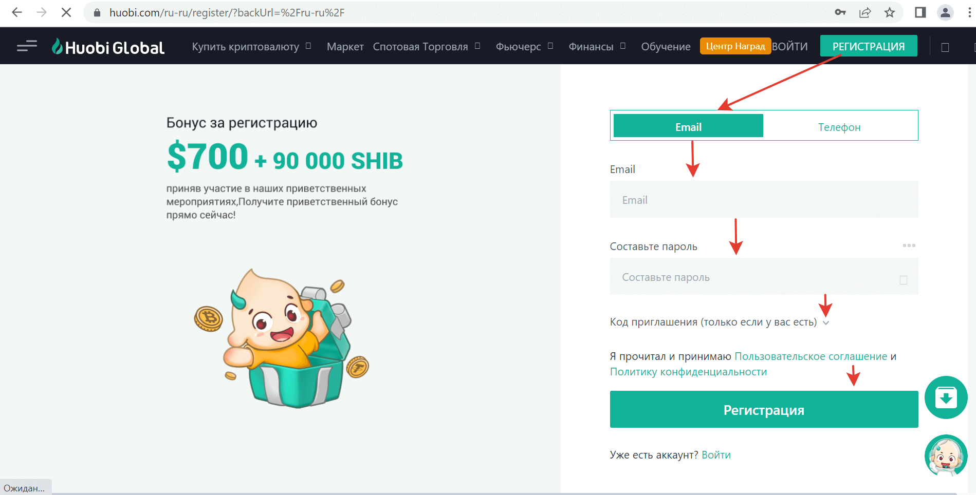 Глобальная биржа криптовалют предлагает вознаграждения и Welcome бонусы для торговцев валютами, создавших идентифицированную учетную запись. Регистрация на Хуоби осуществляется с помощью адреса e-mail или номера мобильного телефона. Контактная информация позволяет подтверждать согласие пользователя с условиями проекта.