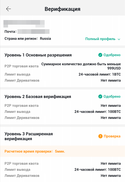 Без подтверждения персональных данных вывод доступен с ограничениями до 0,06 биткоина за сутки, а для спотовой и P2P торгов лимит не должен превышать от 12439 RUB, фьючерсы недоступны. С верификацией в день выводится до 100 bitcoin, а в остальном ограничения отсутствуют.