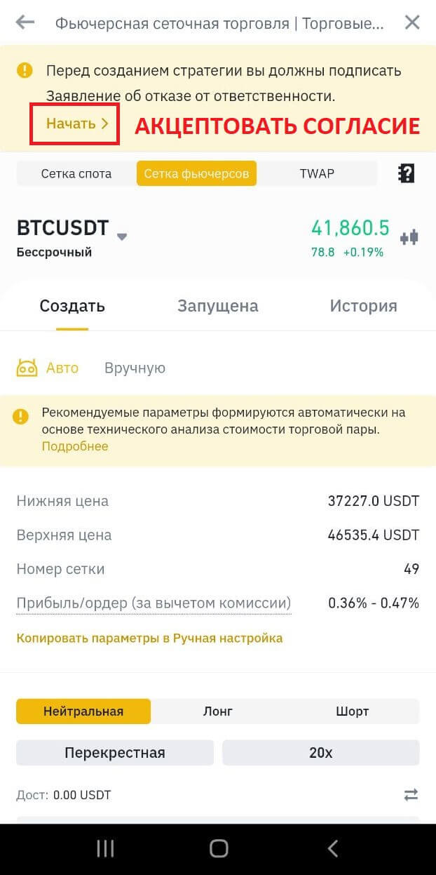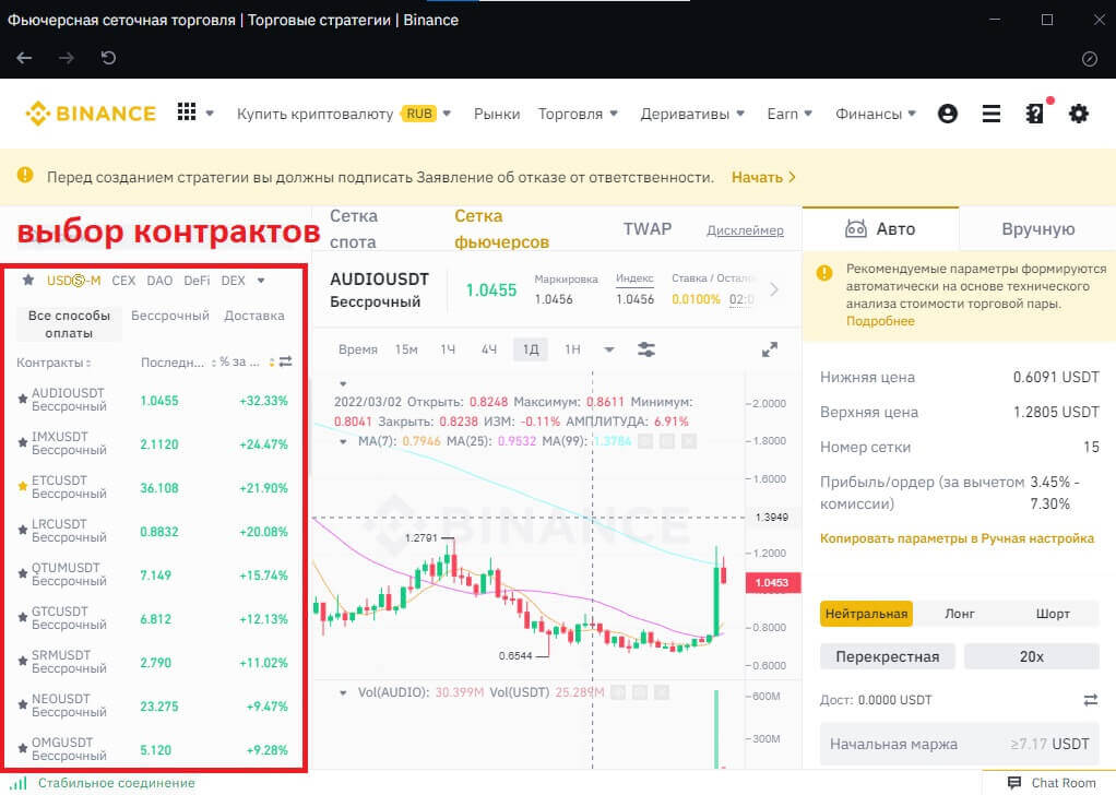 В настоящее время такой тип трейдинга доступен только на фьючерсах, на споте Бинанс настроить робота к моменту публикации материала не представлялось возможным. Далее рассмотрим принцип сбора и функционирования с применением программы для настольных компьютеров. В мобильном приложении и веб-версии принципы настройки и разделы полностью идентичны.
