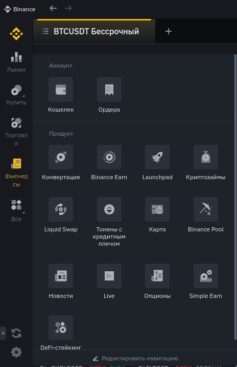 После входа клиент может использовать все доступные (в зависимости от объема торгового капитала и уровня верификации) на Бинанс инструменты. Далее коротко рассмотрим представленные разделы.