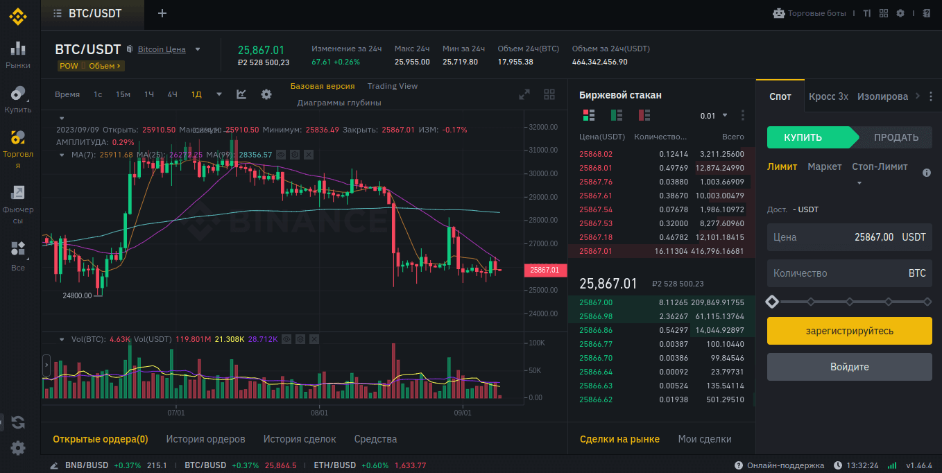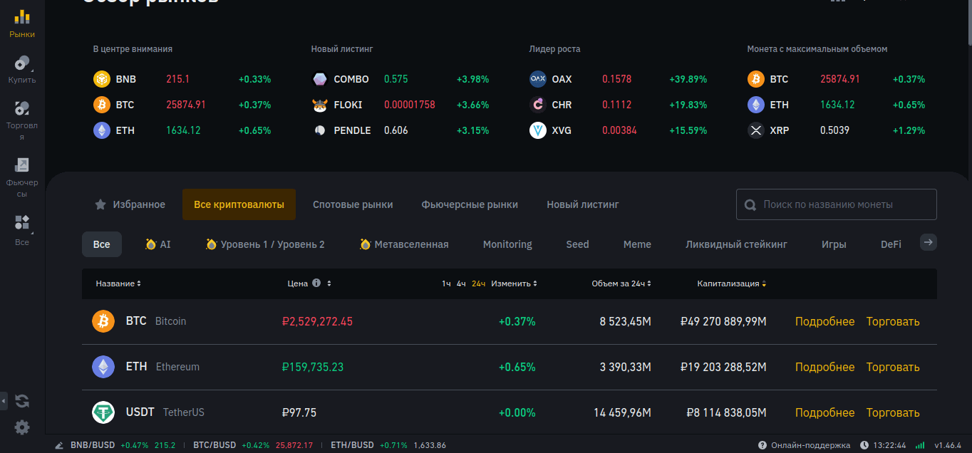Криптовалютная биржа Бинанс — неоспоримый лидер рынка цифровых активов последние несколько лет. Здесь каждый клиент сможет найти для себя инструменты для заработка — от волатильных криптовалютных пар до деривативов и пассивных средств увеличения дохода. Клиентам предлагаются интерфейс веб-браузера для проведения операций, мобильные и стационарные программы на ноутбуки и ПК для всех современных операционных платформ.